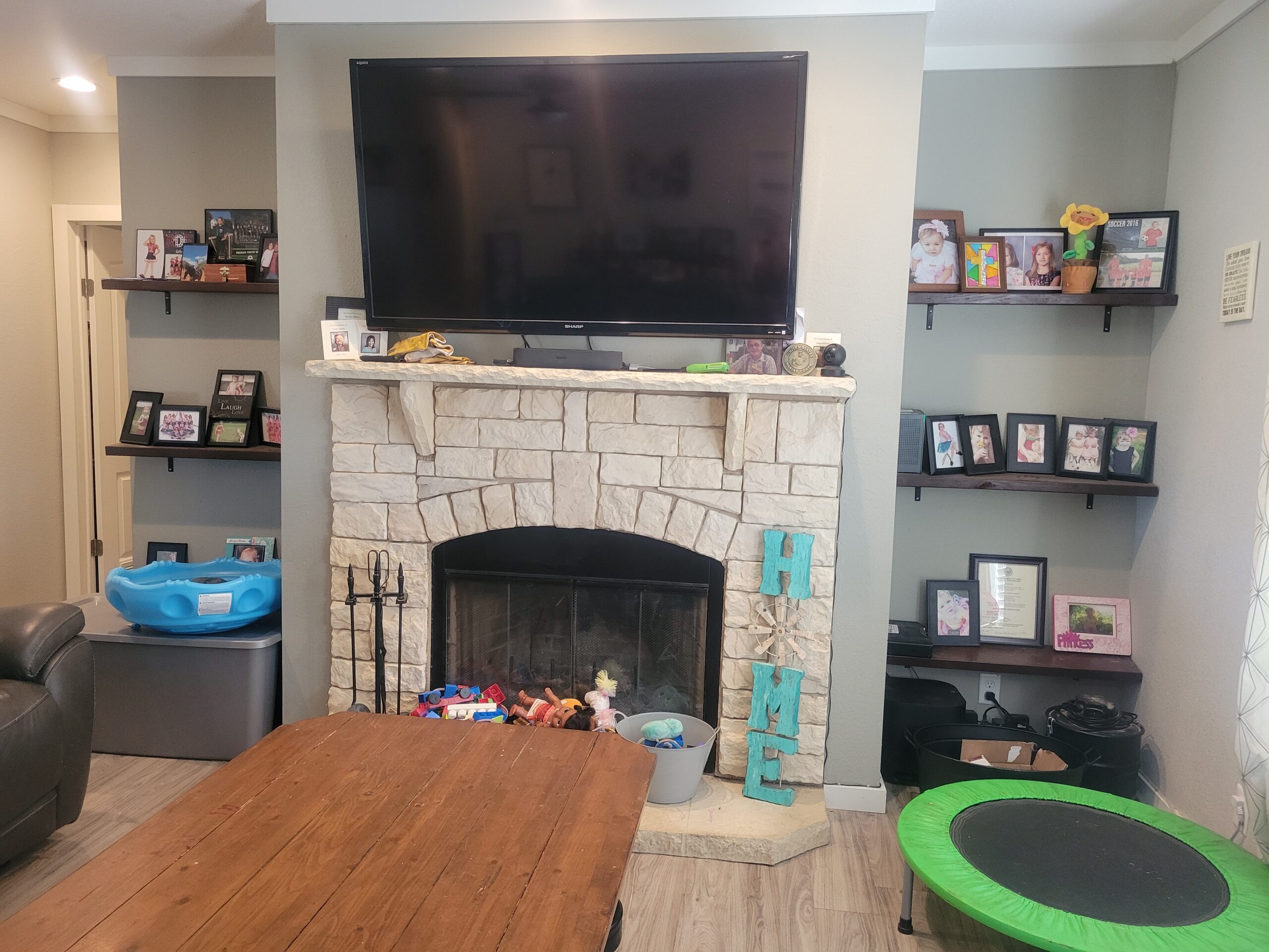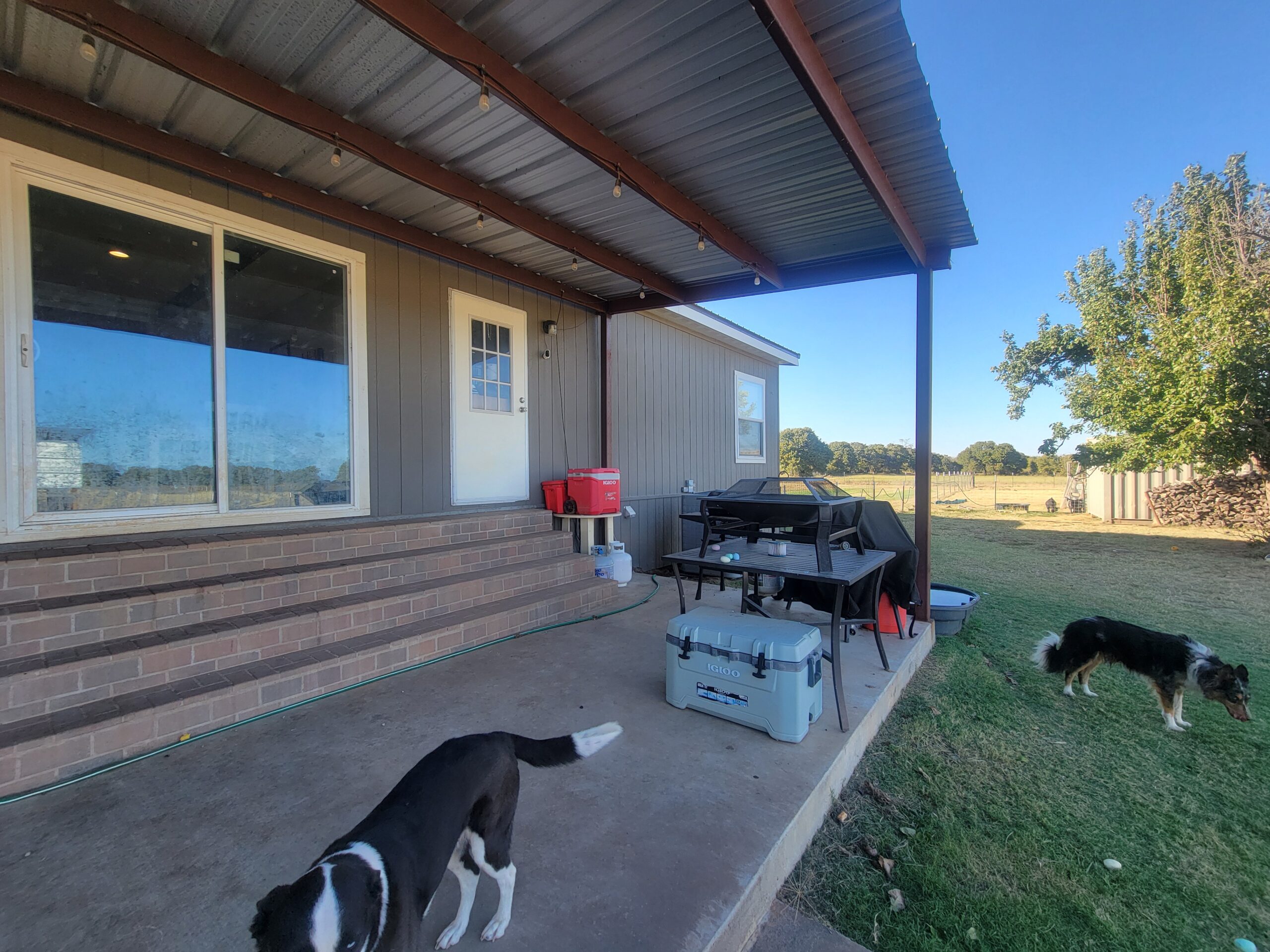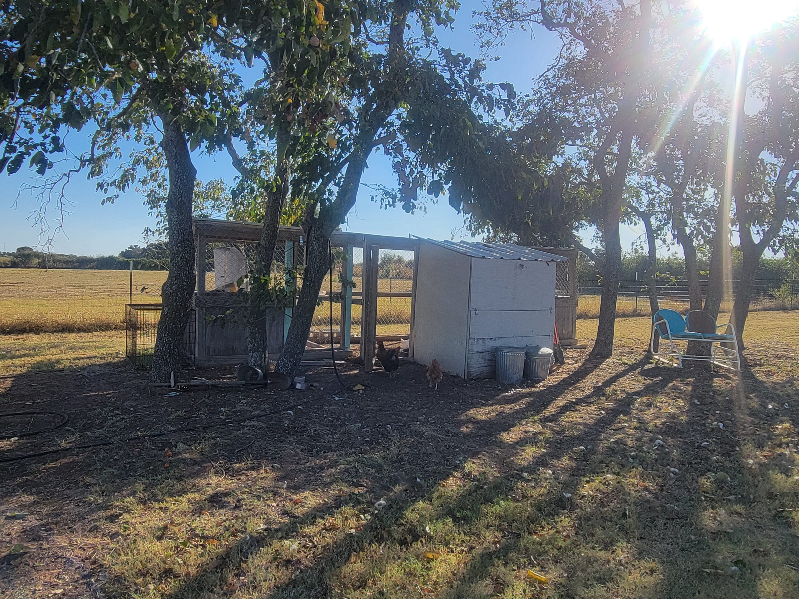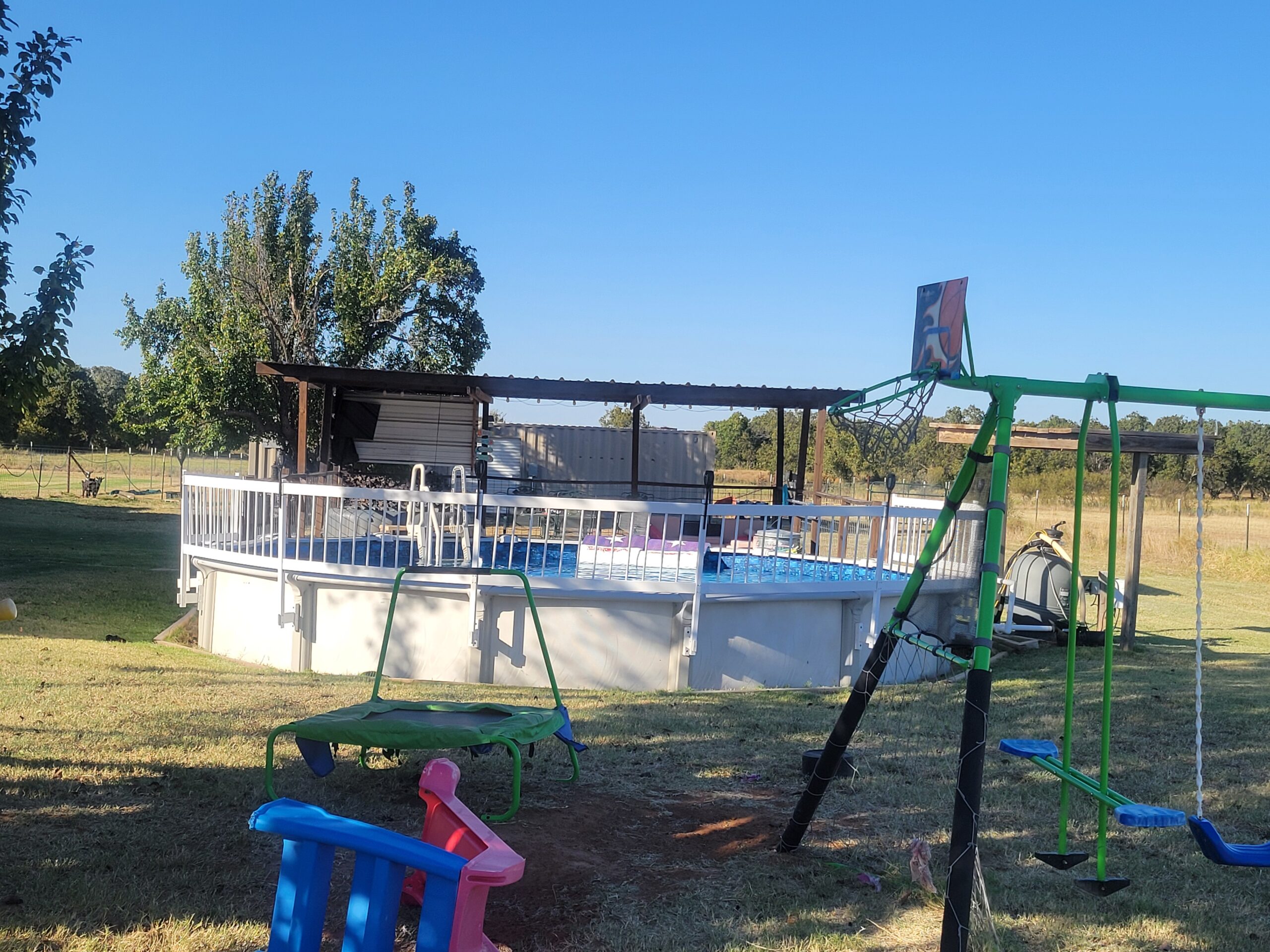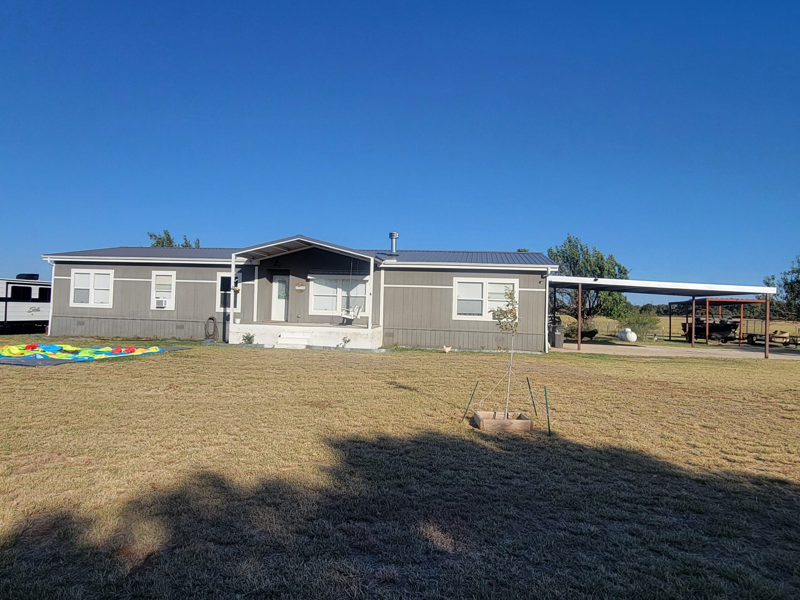 Welcome to this spacious well-appointed 5-bedroom, 3-bath home situated on a fully fenced 2-acre property, ideal for those seeking privacy, functionality, & a touch of country living. A solar-powered gate welcomes you into the property, where you’ll find a chip seal driveway, mature pear trees, & ample space for both relaxation & recreation. The home itself is a beautifully maintained double-wide with a metal roof, featuring a 2-car carport & an additional covered parking space for a boat or RV. Inside, the open-concept living area is perfect for gathering, with decorative ceiling beams, can lighting, & a large living room centered around a cozy wood-burning fireplace accented in Austin limestone. The kitchen offers a generous island with a breakfast bar, solid surface countertops, a stainless steel apron sink, & a walk-in pantry. Stainless appliances include a dishwasher & vent hood, with a propane stove & water heater providing efficient functionality. The adjacent dining area & spacious utility room-with access to the covered back patio-enhance everyday convenience. The layout offers excellent separation of space, with four secondary bedrooms & two full baths on one side of the home, & a master suite on the other. The oversized primary bedroom includes 2 walk-in closets, a spa-like ensuite featuring a large soaking tub, a walkthrough shower, double vanity, separate makeup vanity, & abundant linen storage. A dedicated media-playroom with beadboard paneling & decorative ceiling beams adds flexibility & charm. Outside, the amenities continue with an above-ground pool that is fully fenced, a chicken coop, an 8×40 storage container, & a covered patio ideal for relaxing or entertaining. The property also includes solar panels, a 200-gallon propane tank, with a yearly lease, & a 380 ft. deep water well with a sulfur filter & water softener. This home blends comfort, energy efficiency, and rural charm in a quiet setting with everything you need to live, play, and thrive.