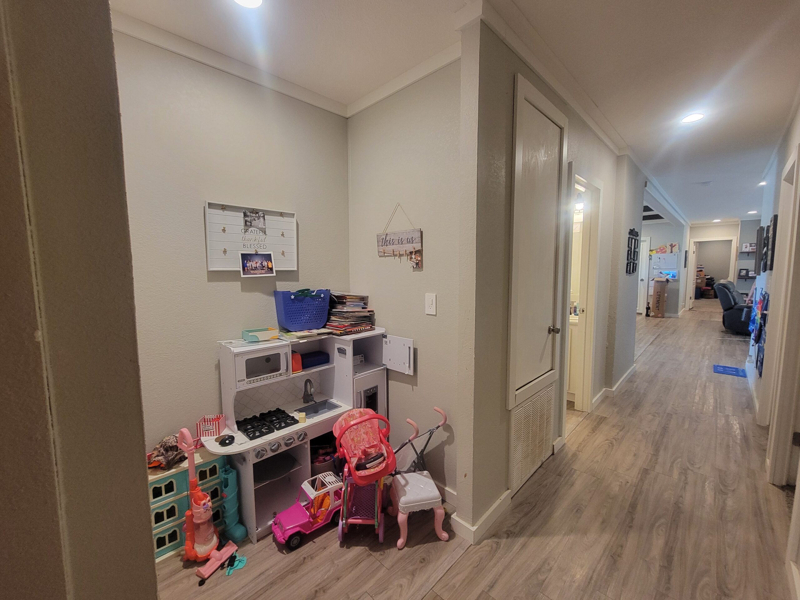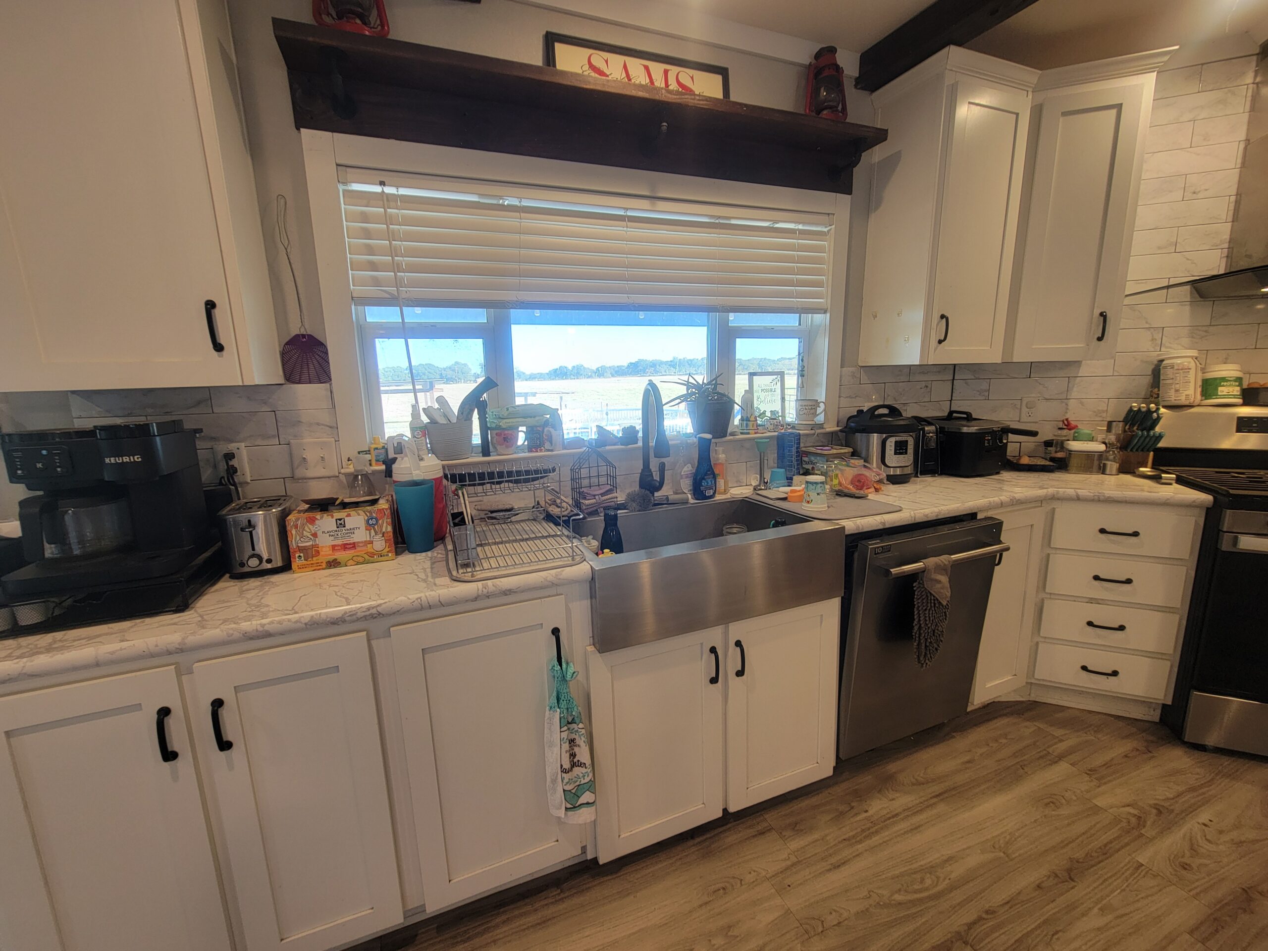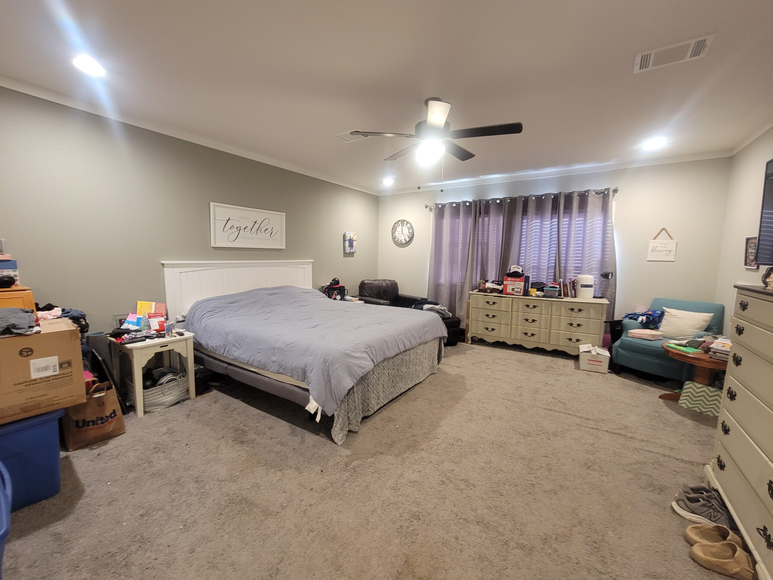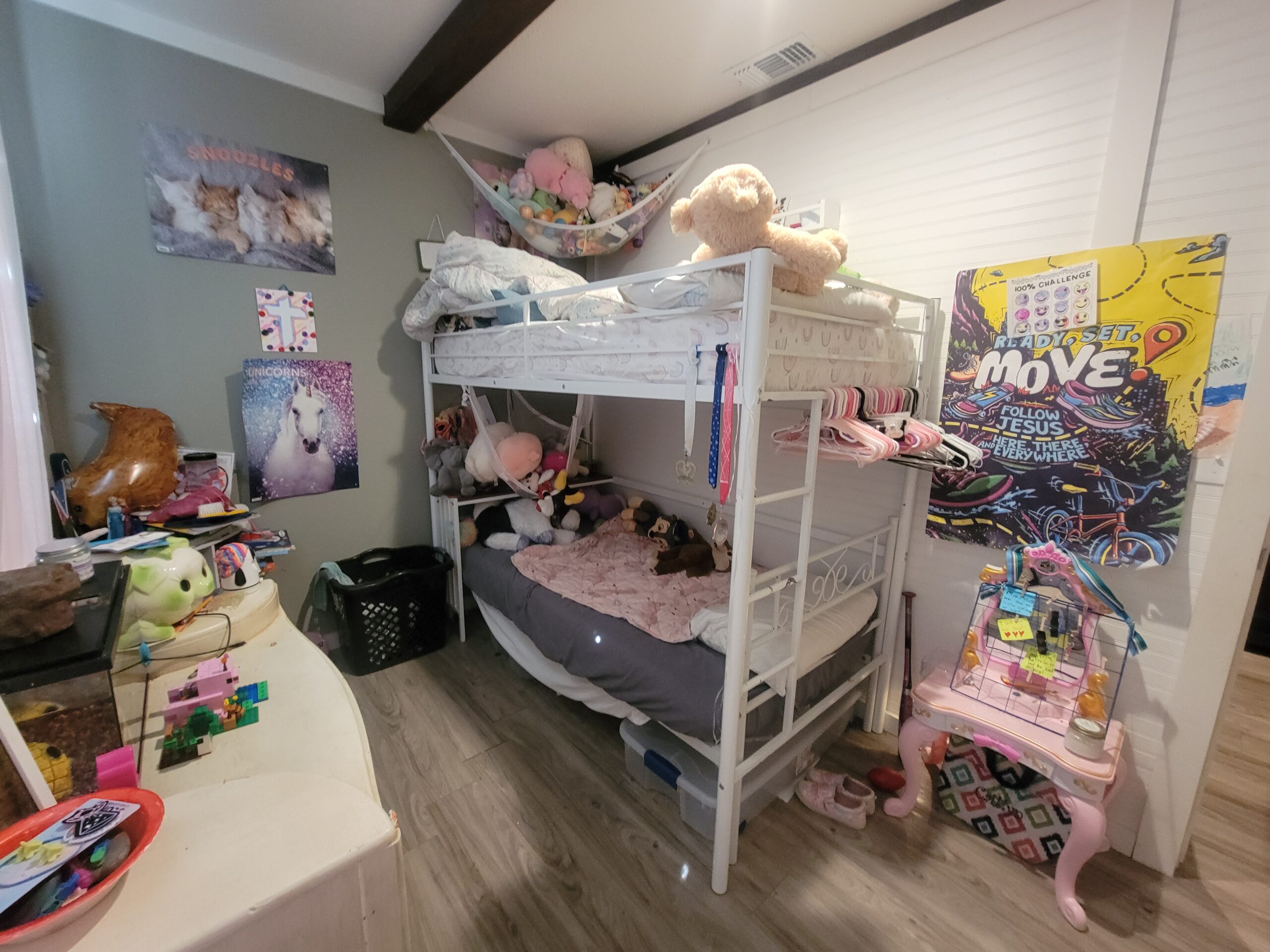 Welcome to this spacious well-appointed 5-bedroom, 3-bath home situated on a fully fenced 2-acre property, ideal for those seeking privacy, functionality, & a touch of country living. A solar-powered gate welcomes you into the property, where you’ll find a chip seal driveway, mature pear trees, & ample space for both relaxation & recreation. The home itself is a beautifully maintained double-wide with a metal roof, featuring a 2-car carport & an additional covered parking space for a boat or RV. Inside, the open-concept living area is perfect for gathering, with decorative ceiling beams, can lighting, & a large living room centered around a cozy wood-burning fireplace accented in Austin limestone. The kitchen offers a generous island with a breakfast bar, solid surface countertops, a stainless steel apron sink, & a walk-in pantry. Stainless appliances include a dishwasher & vent hood, with a propane stove & water heater providing efficient functionality. The adjacent dining area & spacious utility room-with access to the covered back patio-enhance everyday convenience. The layout offers excellent separation of space, with four secondary bedrooms & two full baths on one side of the home, & a master suite on the other. The oversized primary bedroom includes 2 walk-in closets, a spa-like ensuite featuring a large soaking tub, a walkthrough shower, double vanity, separate makeup vanity, & abundant linen storage. A dedicated media-playroom with beadboard paneling & decorative ceiling beams adds flexibility & charm. Outside, the amenities continue with an above-ground pool that is fully fenced, a chicken coop, an 8×40 storage container, & a covered patio ideal for relaxing or entertaining. The property also includes solar panels, a 200-gallon propane tank, with a yearly lease, & a 380 ft. deep water well with a sulfur filter & water softener. This home blends comfort, energy efficiency, and rural charm in a quiet setting with everything you need to live, play, and thrive.